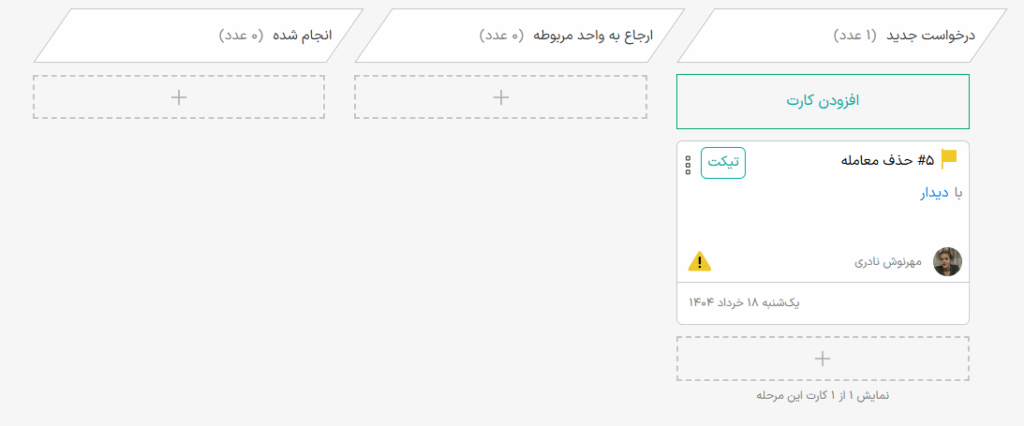 برای مثال، فرض کنید مشتری یک تیکت با عنوان “حذف معامله” ایجاد کرده است. این تیکت به صورت پیشفرض داخل کاریز پشتیبانی و در مرحله “درخواست جدید” قرار میگیرد.