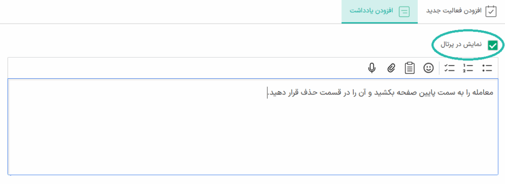 برای پاسخ به تیکت کافی است روی افزودن یادداشت کلیک کنید، متن پاسخ را بنویسید و گزینه نمایش در پرتال را فعال کنید. این گزینه اختیاری است تا در صورت نیاز، یادداشتی برای خودتان ذخیره کنید یا با منشن کردن همکاران، بدون اینکه مشتری از آن مطلع شود با یکدیگر مشورت کنید.