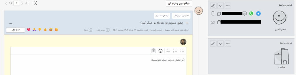 مسئول پاسخگویی، کارت را باز کرده و محتوای تیکت را بررسی میکند. اطلاعات مشتری سمت راست و شرح تیکت سمت چپ نمایش داده میشود.