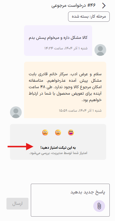 در نهایت، شخص مسئول (کارشناس پشتیبان) میتواند تیکت را ببندد و پس از بسته شدن، یک نظرسنجی برای مشتری ارسال میشود تا رضایت او از پاسخگویی ارزیابی شود. نتیجه نظرسنجی نیز در همان کارت تیکت قابل مشاهده است.