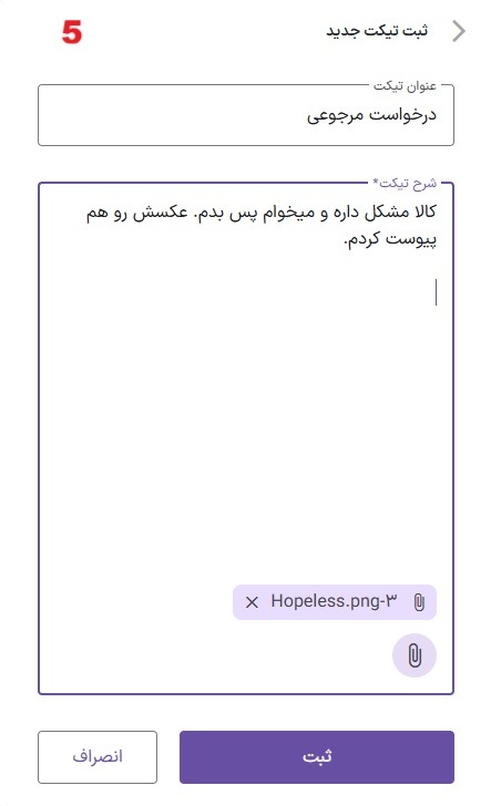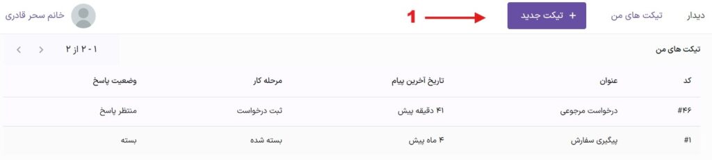 علاوه بر این، مشتری میتواند سوابق تمام تیکتهای خود را مشاهده کند. این سوابق شامل عنوان، مرحله کار و وضعیت پاسخ است. با کلیک روی هر تیکت، محتوای مکالمه با تیم پشتیبانی نمایش داده میشود.