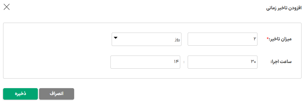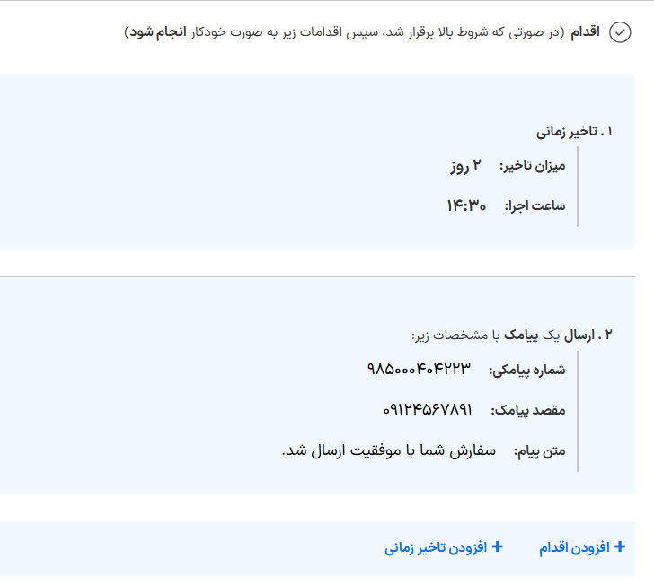 برای مثال مشخص می کنید که 2 روز بعد (بعد از برقراری شروط اتومیشن)، یک پیامک در ساعت 14:30 برای شخصی ارسال گردد.