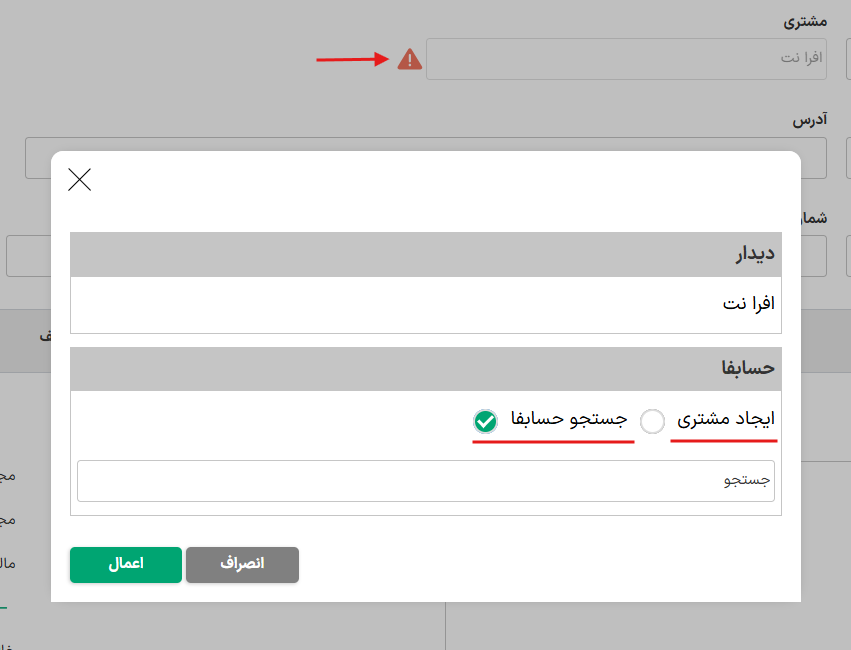 در صورتی که مشتری از قبل در حسابفا وجود ندارد با انتخاب گزینه ی ” ایجاد مشتری، اطلاعات شخص یا شرکت دیداری را به حسابفای خود اضافه کنید.