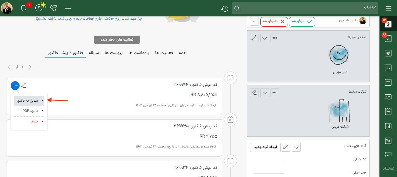• – پس از ثبت پیش فاکتور با کلیک بر روی آیکن سه نقطه، امکان تبدیل آن به فاکتور وجود دارد.
